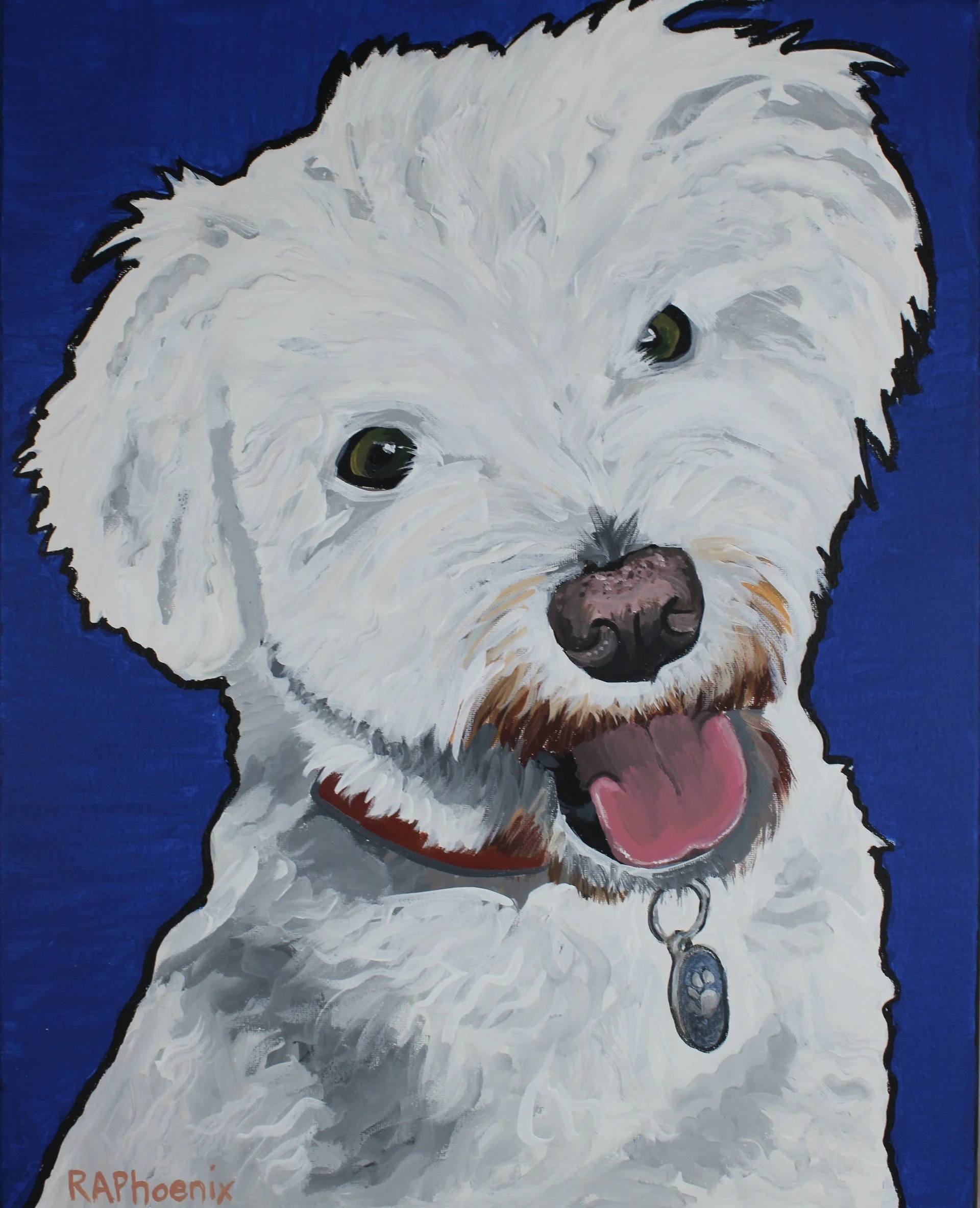 I paint pets; mine, my children’s, my children’s friends, my friends, my neighbors, friends of friends.  Paint is fast, easy and expressionistic.   I estimate over half of my subjects have crossed over rainbow bridge.